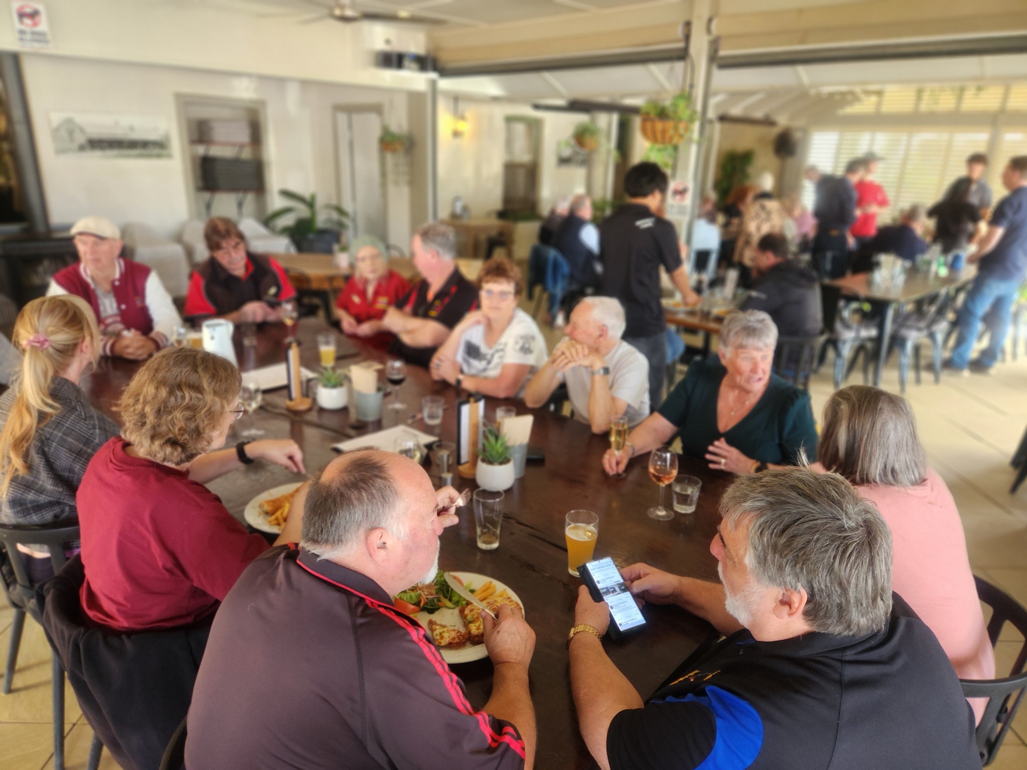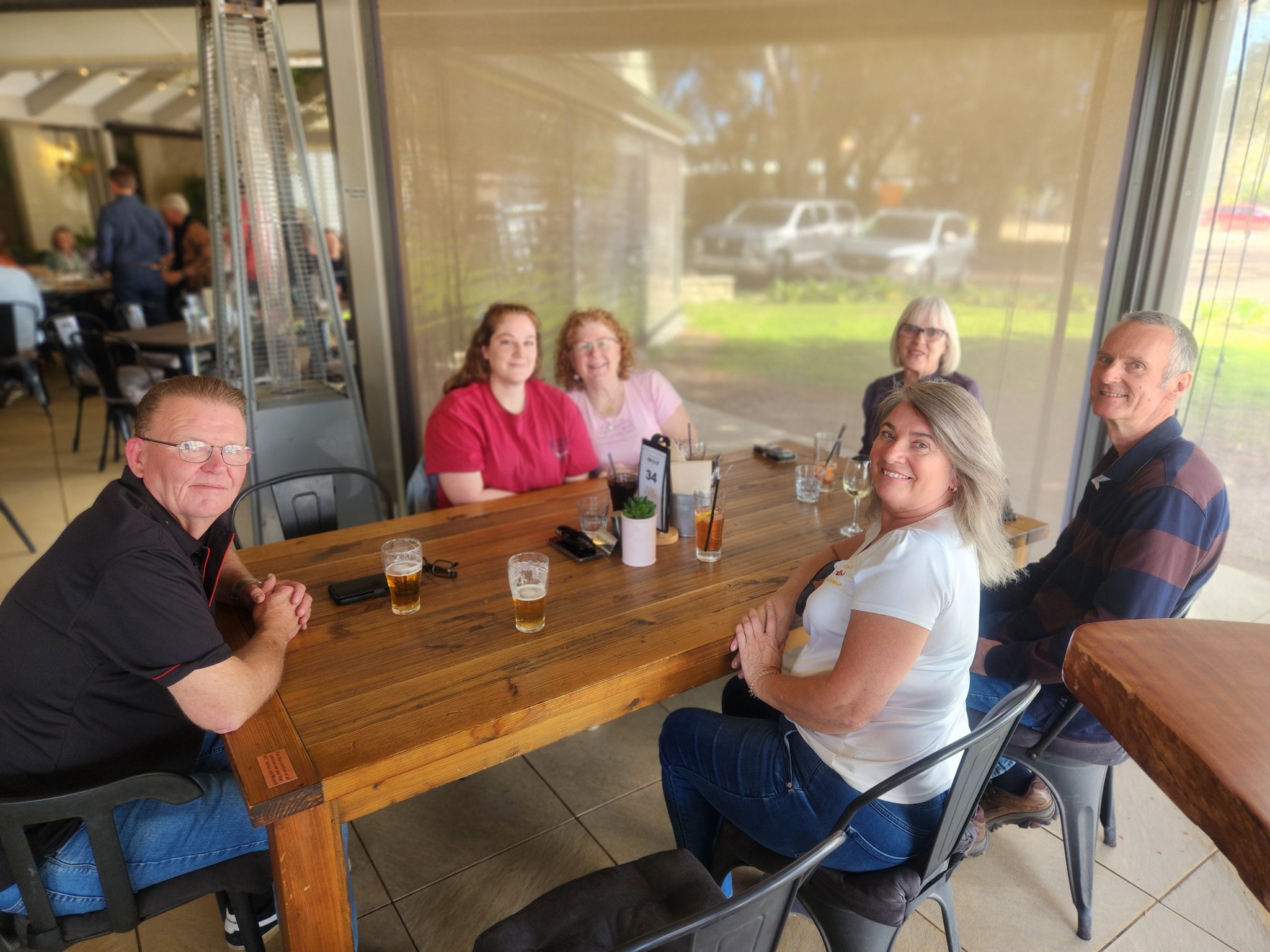 eventually the photo was done and we could drive back for Pizza. After pizza, we headed back thru Parkes and out to the Dish for a well-deserved golden gay time. Then everyone was back for refreshments and watching the Crows game with Gary and Cathy.